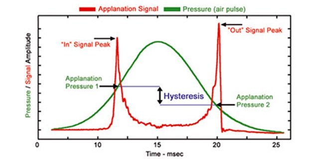 La histéresis corneal es la diferencia en los valores de presión hacia adentro y hacia afuera obtenidos durante el proceso de aplanamiento bidireccional dinámico patentado utilizado por el analizador de respuesta ocular. Es una caracterización de la capacidad de la córnea para absorber y disipar energía, que es una función de las propiedades biomecánicas viscoelásticas de la córnea..