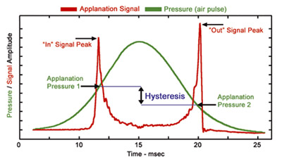 角膜迟滞是 Ocular Response Analyzer 在专利的动态双向压平过程中获得的向内和向外压力值的差异。它是角膜吸收和消散能量能力的表征,是角膜粘弹性生物力学特性的函数。